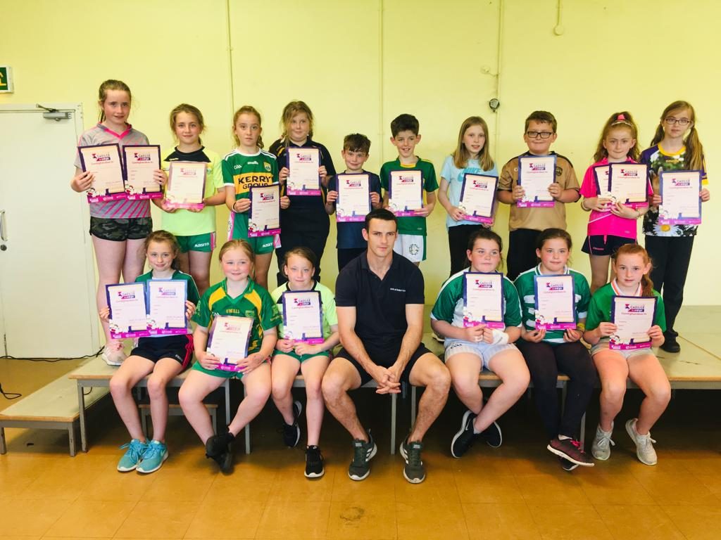 On Thursday, June 27th Kerry Senior Football star Shane Enright presented the boys and girls in our school with participation certificates for their participation in the National Seachtain na Gaeilge competition during Seachtain na Gaeilge. Entries from our school comprised of poetry and artworks based on traditional Irish sayings. We had three winners at national level which was an enormous achievement. These winners were Ryan O’Sullivan (Senior Infants), Raonaid Ross (Rang 4) and Reece O’Connor (Rang 6). Congratulations to all involved!