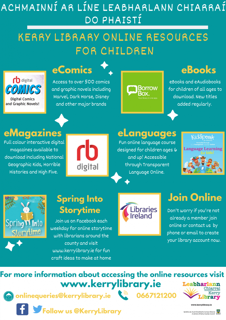 All Kerry Library members have free access to eBooks, eAudiobooks, eComics, eMagazines and eLanguage Learning courses using their library card details.