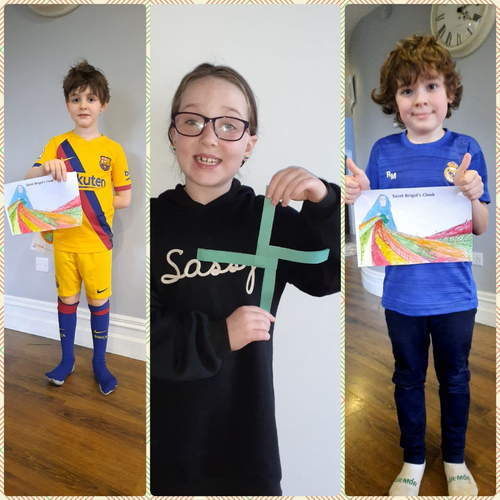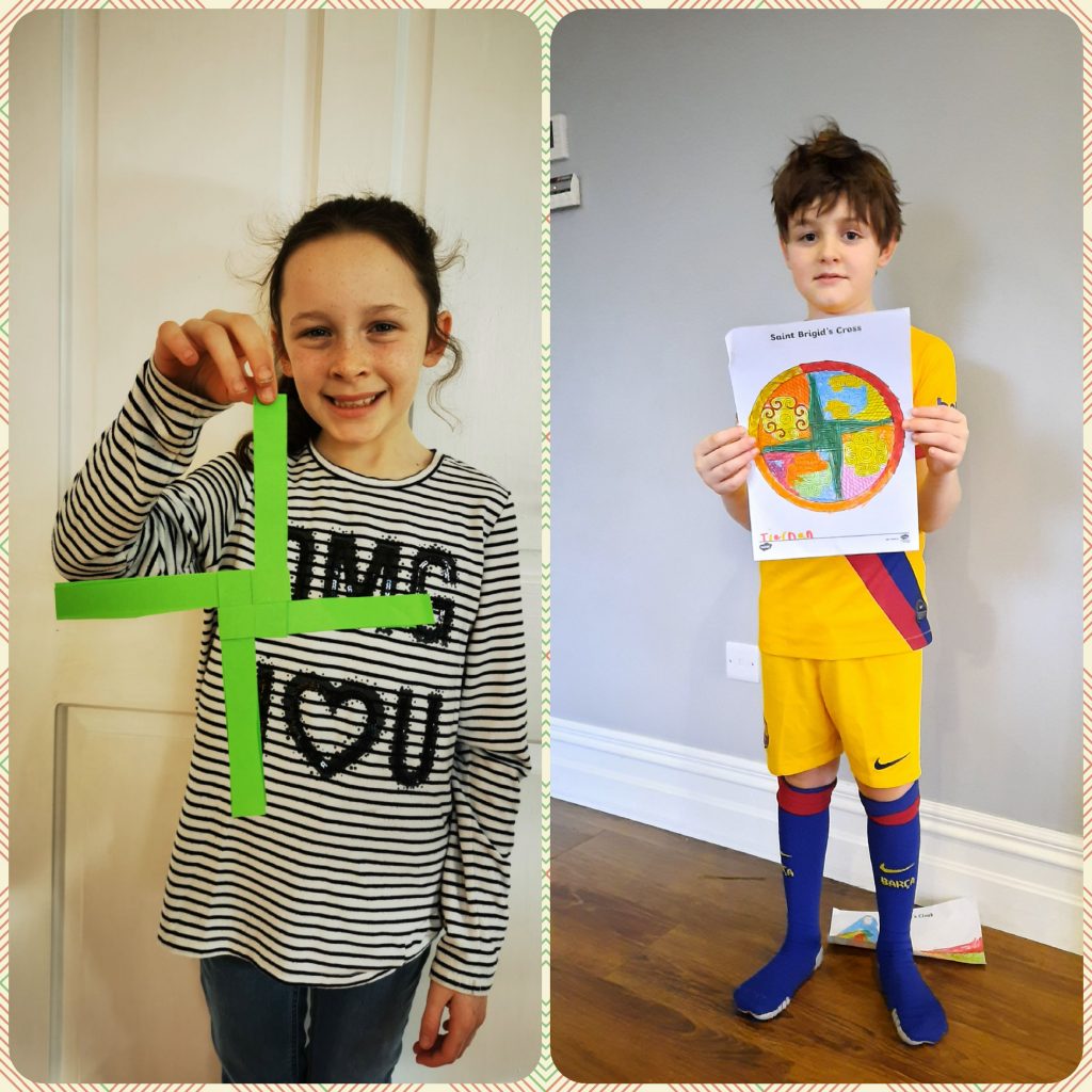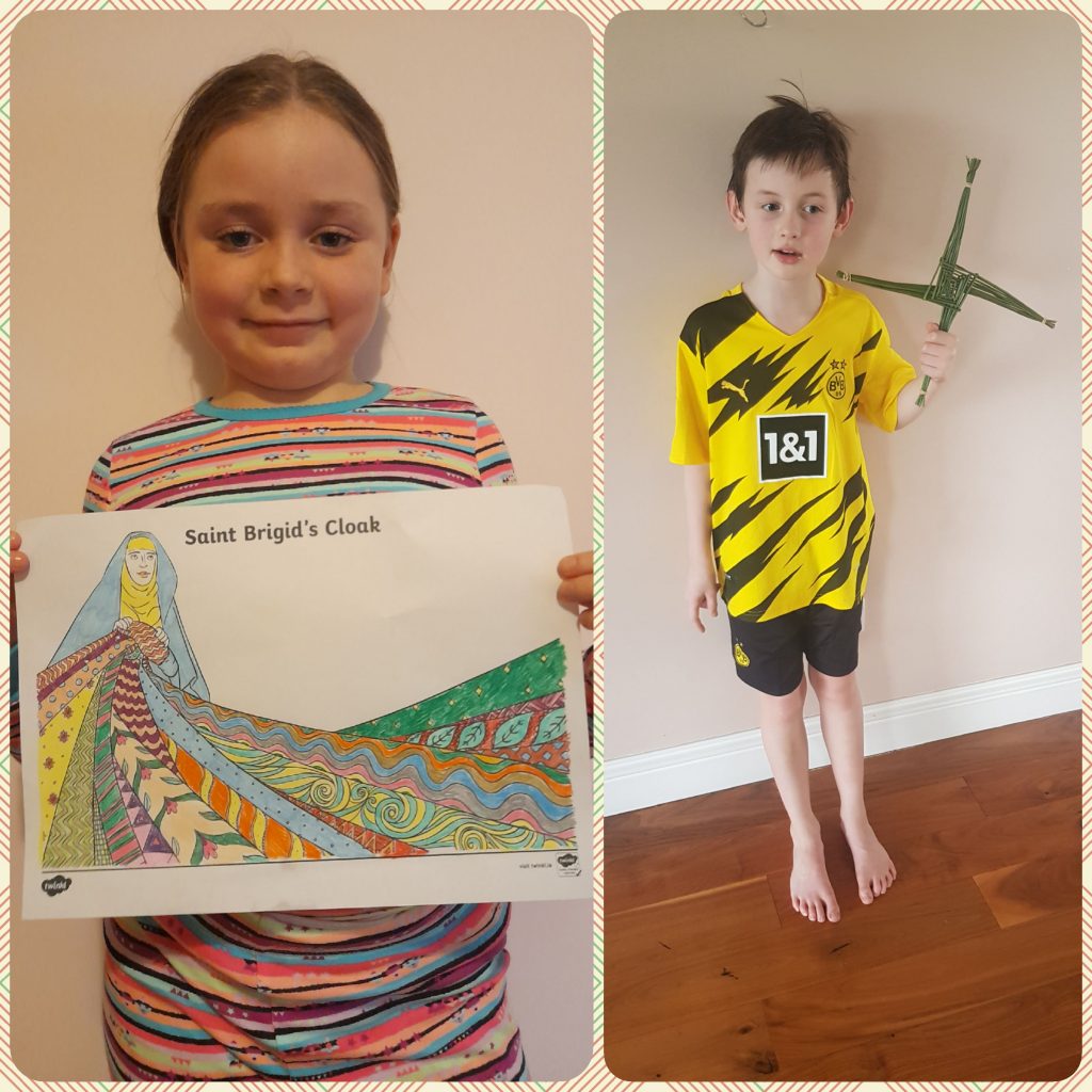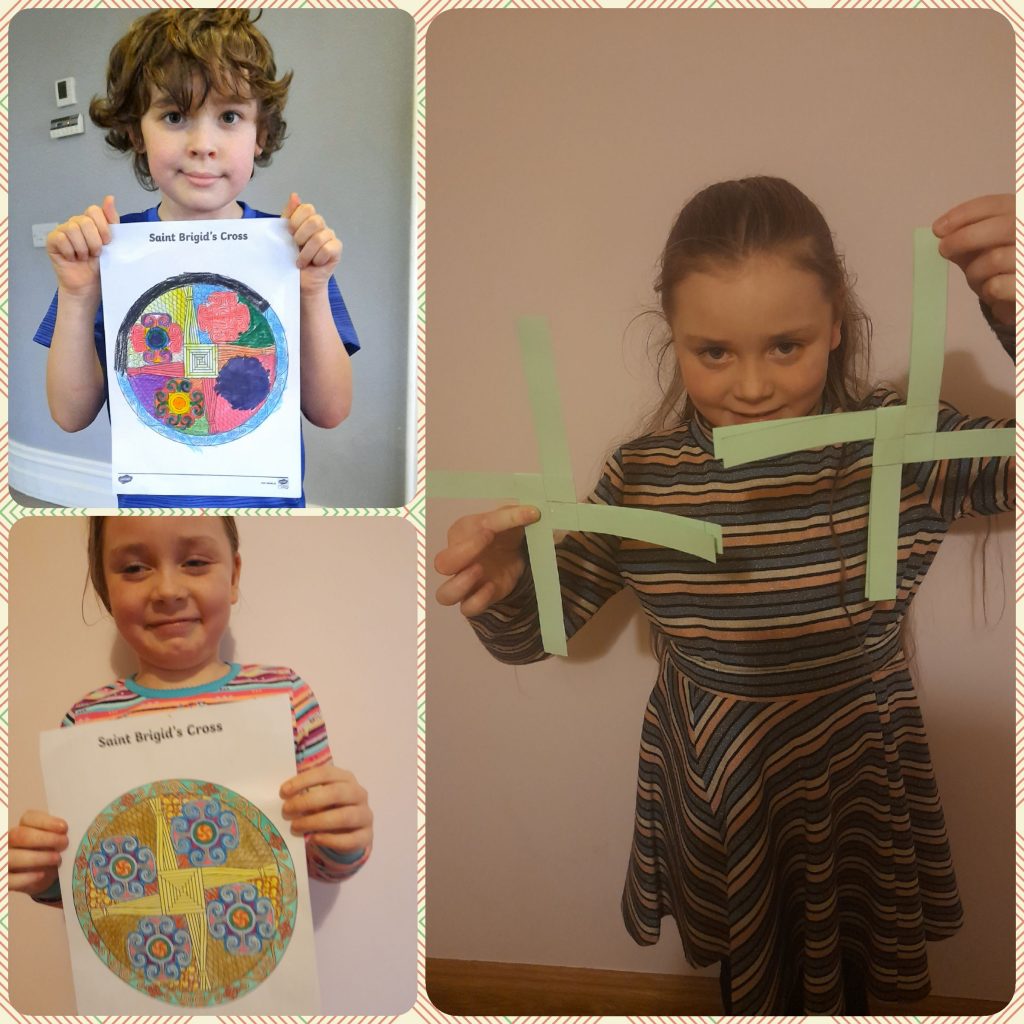 They learned about St. Bridget this week and to celebrate Saint Bridget’s day they made some art pieces. They made Saint Bridget’s crosses and coloured pictures of her cloak and her cross.